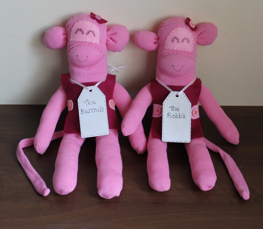 Recently i have been making sock animals in the dozens. Everyone seems to want them. I do love making them as i like to give each one its own individuality and i'm always trying to come up with new designs. i thought i'd dedicate this post to some of the monkeys i have made over the last few months. If you want to have a go at making your own then drop me an e-mail and i'll send you the instructions of a basic monkey. If you don't want to make one but want to give some love to one that i've made then visit my Facebook page and pick a monkey to buy. They start at £8.50 for basic monkey's and you can add accessories and name tags and other bits and bobs as you go along. I am also taking part in a charity auction in aid of McMillan nurses and Iris my pink and white sock monkey at the end of this post is up for auction so pop along to the wonderful Supermum's Craft Fair Facebook Page and have a peek at all the fab items up for auction. If you wa nt to bid on Iris then click on the link Here. The auction starts on Thursday 22 March 2012.